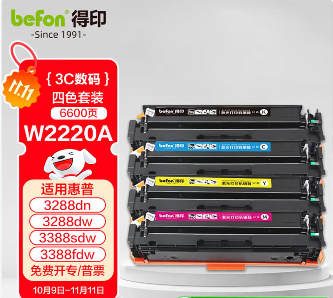 得印W2220A/222A硒鼓 適用惠普3388sdw硒鼓 3388fdw 3288dn/dw粉盒3388fdn墨盒標準版含芯片四色套裝